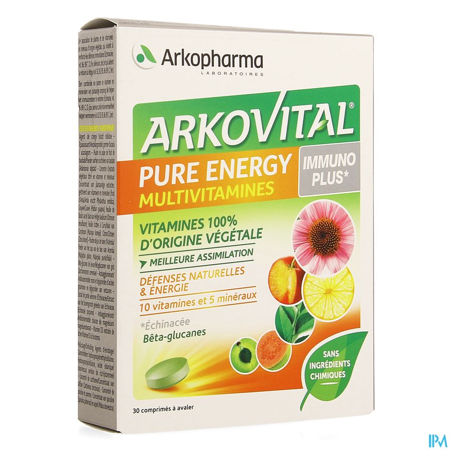 Arkovital Pure Energy Immunoplus Comp 30 est un complément alimentaire disponible en pharmacie. Il ne peut se substituer à un mode de vie sain et à une alimentation variée et équilibrée. Ne prenez pas plus que la dose quotidienne recommandée indiquée sur l'emballage. Demandez conseil à votre pharmacien. Tenir hors de portée des enfants.