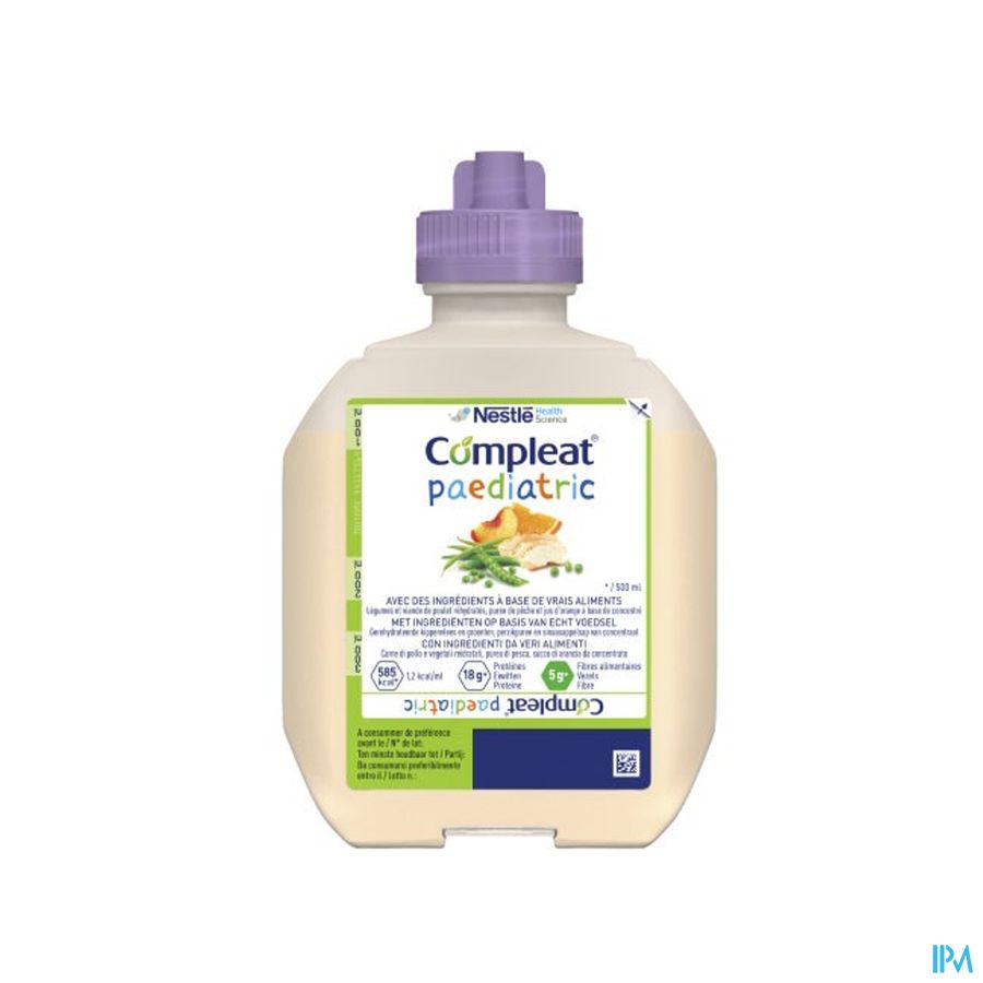 Compleat Paediatric est un aliment complet composé de vrais ingrédients alimentaires (viande de poulet et légumes réhydratés, purée de pêche et jus d'orange à base de concentré). Contient de l'énergie (1,2 kcal/ml), des protéines (18g/500ml), des fibres (5g/500ml). Convient dès l'âge de 1 an.