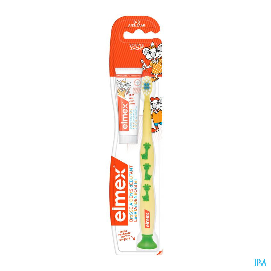 La brosse à dents elmex® Débutant 0-3 ans, avec le mini dentifrice elmex® Bébé, est conçue pour un nettoyage et un soin en douceur des premières dents.