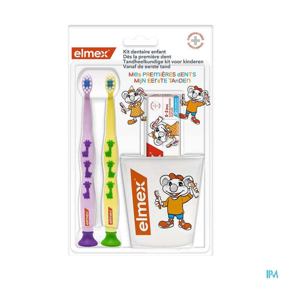 Le kit dentaire enfant elmex®, spécialement conçu pour un nettoyage et un soin en douceur des premières dents, contient 2 brosses à dents elmex® Débutant douce 0-3 ans, 1 dentifrice elmex® Anti-Caries Bébé 0-2 ans et 1 gobelet offert.