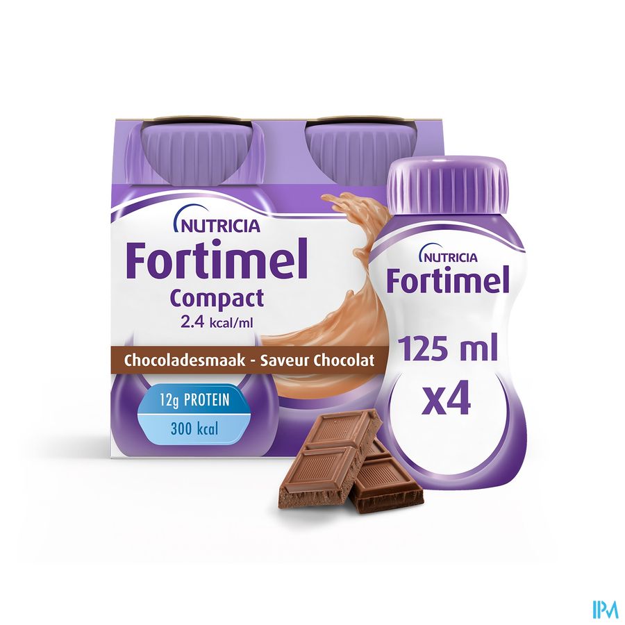 Fortimel Compact 2.4kcal Chocolat 4x125ml est un complément alimentaire disponible en pharmacie. Il ne peut se substituer à un mode de vie sain et à une alimentation variée et équilibrée. Ne prenez pas plus que la dose quotidienne recommandée indiquée sur l'emballage. Demandez conseil à votre pharmacien. Tenir hors de portée des enfants.
