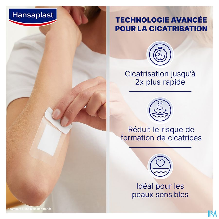 Les pansements Hansaplast à cicatrisation rapide permettent une cicatrisation jusqu'à deux fois plus rapide qu'une cicatrisation à sec et conviennent pour couvrir tous les types de petites plaies. Pour une cicatrisation optimale, le pansement doit être porté pendant plusieurs jours.