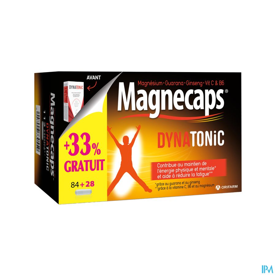 Magnecaps Dynatonic Caps 84 + Caps 28 est un complément alimentaire disponible en pharmacie. Il ne peut se substituer à un mode de vie sain et à une alimentation variée et équilibrée. Ne prenez pas plus que la dose quotidienne recommandée indiquée sur l'emballage. Demandez conseil à votre pharmacien. Tenir hors de portée des enfants.