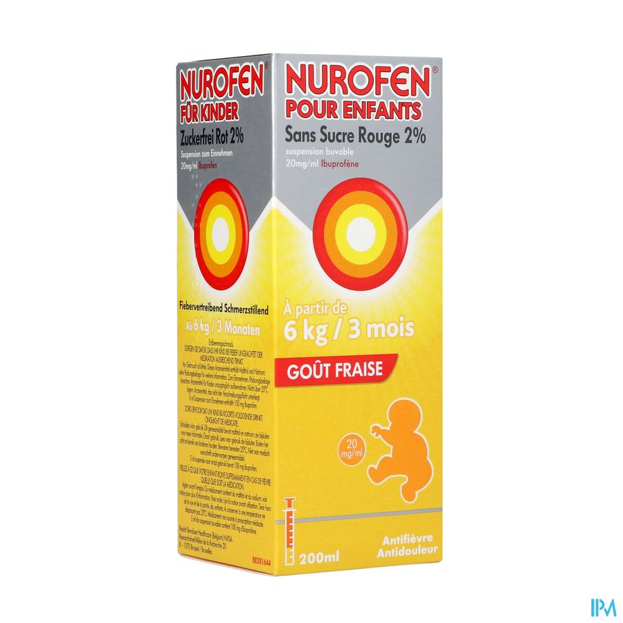 Les autres composants de Nurofen pour Enfants sans sucre rouge 2% suspension buvable sont : polysorbate 80, glycérol, maltitol liquide, saccharine de sodium, acide citrique monohydrate, citrate de sodium, gomme xanthane, chlorure de sodium, aromatisant de fraise (contient du propylène glycol), bromure de domiphène, eau purifiée.