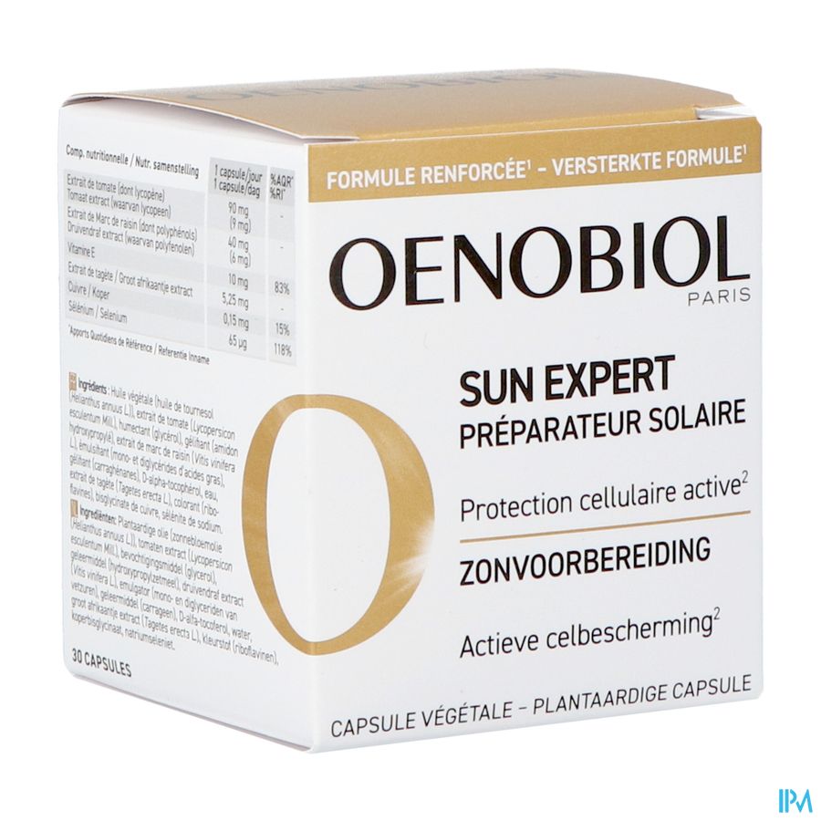 Oenobiol Sun Expert Caps 30 est un complément alimentaire disponible en pharmacie. Il ne peut se substituer à un mode de vie sain et à une alimentation variée et équilibrée. Ne prenez pas plus que la dose quotidienne recommandée indiquée sur l'emballage. Demandez conseil à votre pharmacien. Tenir hors de portée des enfants.