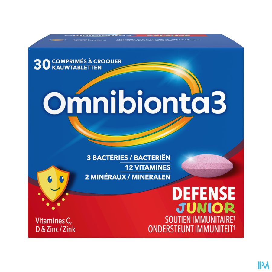 Omnibionta 3 Defense Junior Comp A Croquer 30 est un complément alimentaire disponible en pharmacie. Il ne peut se substituer à un mode de vie sain et à une alimentation variée et équilibrée. Ne prenez pas plus que la dose quotidienne recommandée indiquée sur l'emballage. Demandez conseil à votre pharmacien. Tenir hors de portée des enfants.