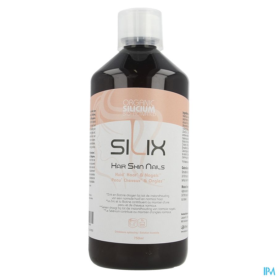 Silix Hair Skin Nails 750ml est un complément alimentaire disponible en pharmacie. Il ne peut se substituer à un mode de vie sain et à une alimentation variée et équilibrée. Ne prenez pas plus que la dose quotidienne recommandée indiquée sur l'emballage. Demandez conseil à votre pharmacien. Tenir hors de portée des enfants.