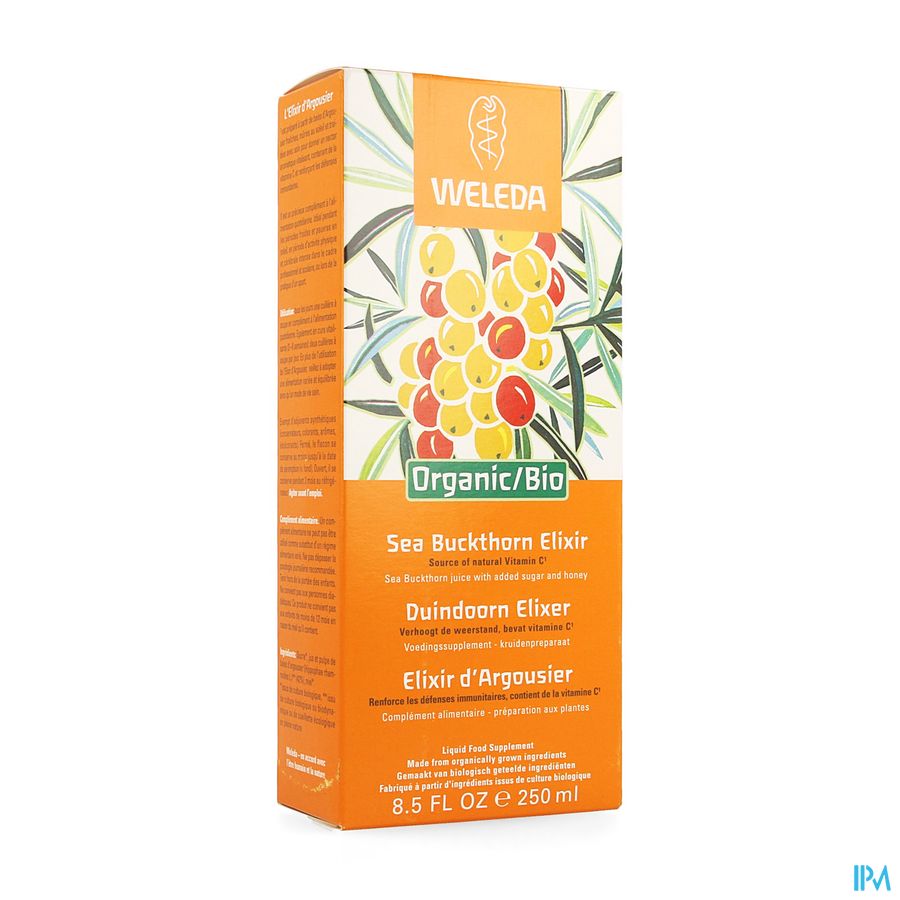 Weleda Elixir Argousier 250ml est un complément alimentaire disponible en pharmacie. Il ne peut se substituer à un mode de vie sain et à une alimentation variée et équilibrée. Ne prenez pas plus que la dose quotidienne recommandée indiquée sur l'emballage. Demandez conseil à votre pharmacien. Tenir hors de portée des enfants.