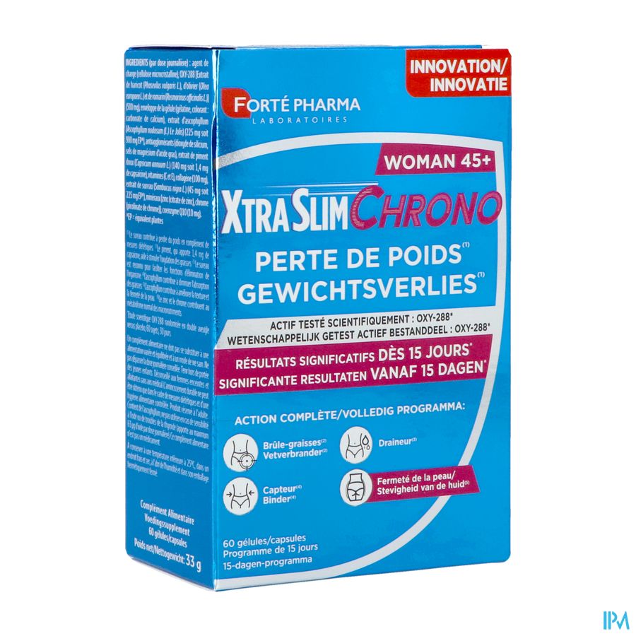 Xtraslim Chrono Woman 45+ Caps 60 est un complément alimentaire disponible en pharmacie. Il ne peut se substituer à un mode de vie sain et à une alimentation variée et équilibrée. Ne prenez pas plus que la dose quotidienne recommandée indiquée sur l'emballage. Demandez conseil à votre pharmacien. Tenir hors de portée des enfants.