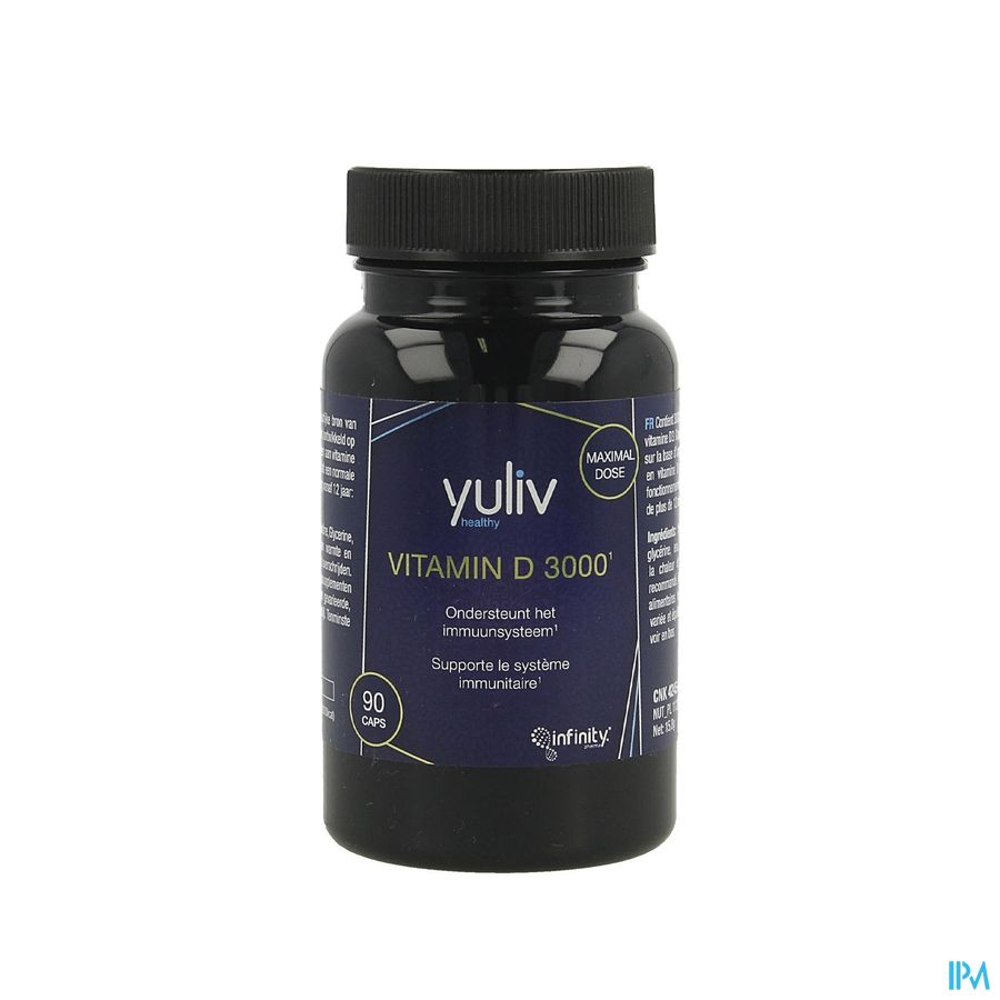 Yuliv Vitamine D 3000 Caps 90 est un complément alimentaire disponible en pharmacie. Il ne peut se substituer à un mode de vie sain et à une alimentation variée et équilibrée. Ne prenez pas plus que la dose quotidienne recommandée indiquée sur l'emballage. Demandez conseil à votre pharmacien. Tenir hors de portée des enfants.
